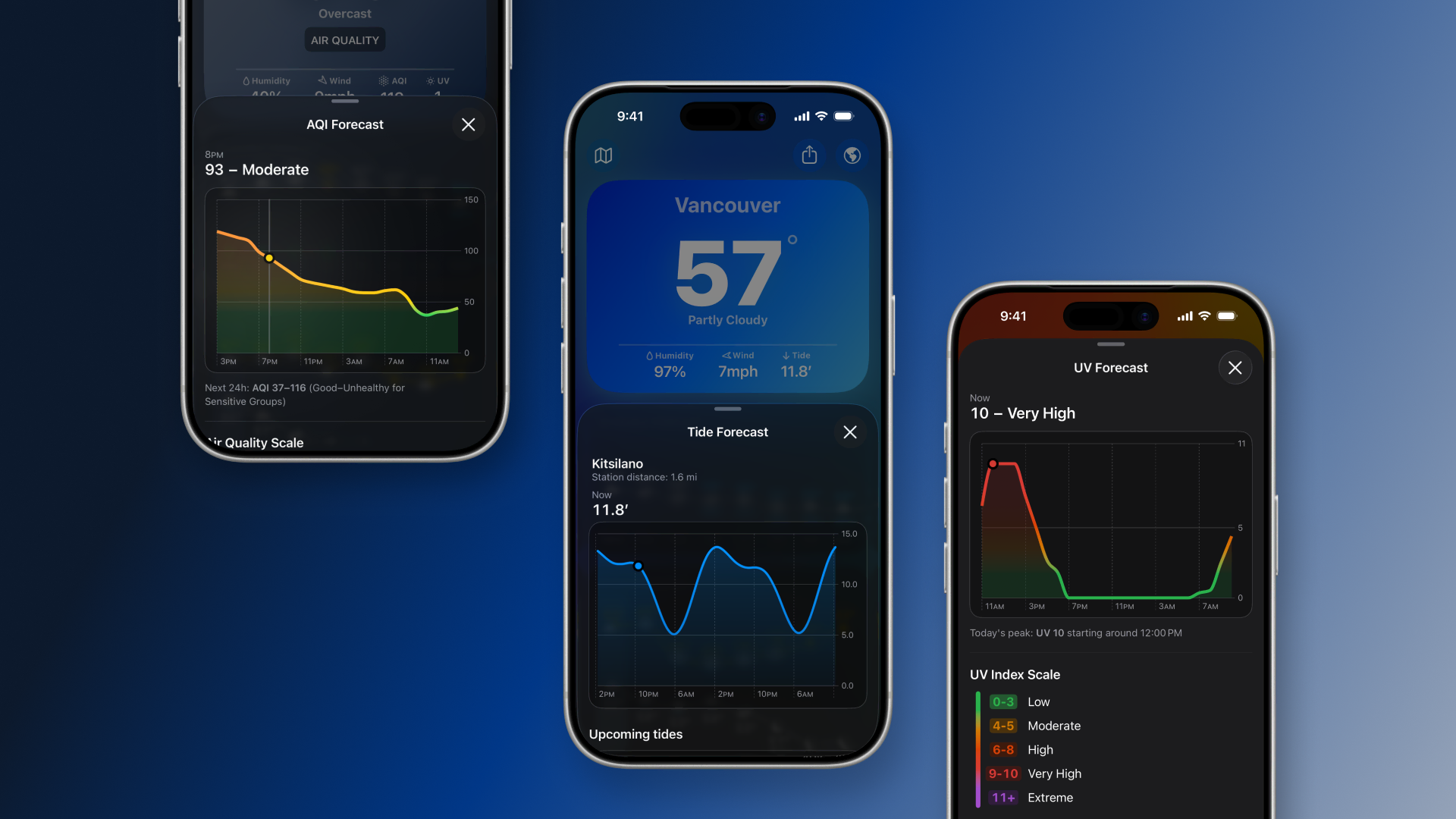 - Other recent additions: This update, of course, also includes the recent features we released, like air quality, extra hourly details (when tapping and holding on an hour in the hourly forecast), and hourly chart customizations.